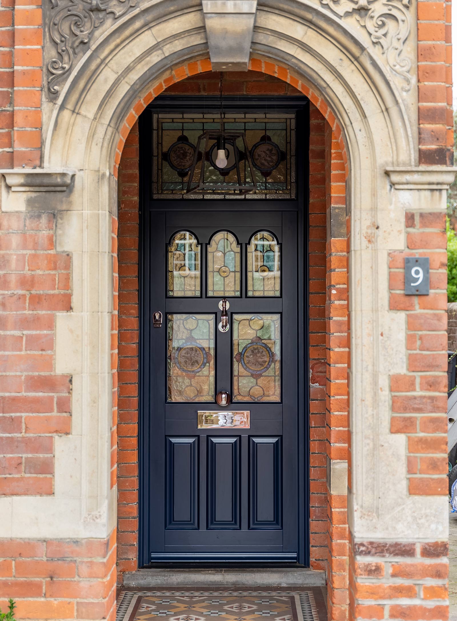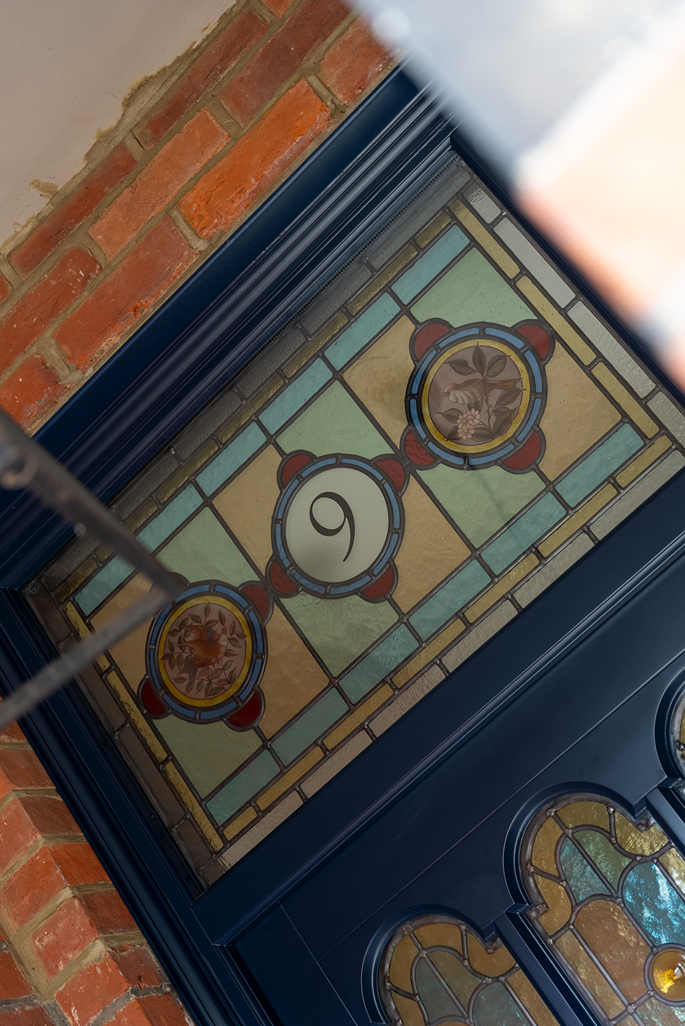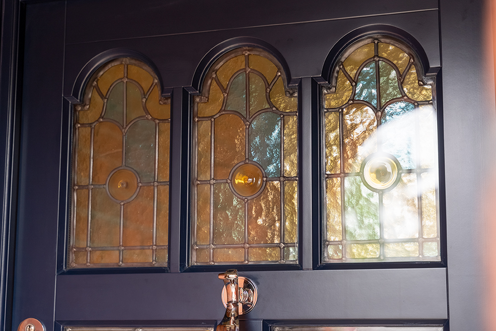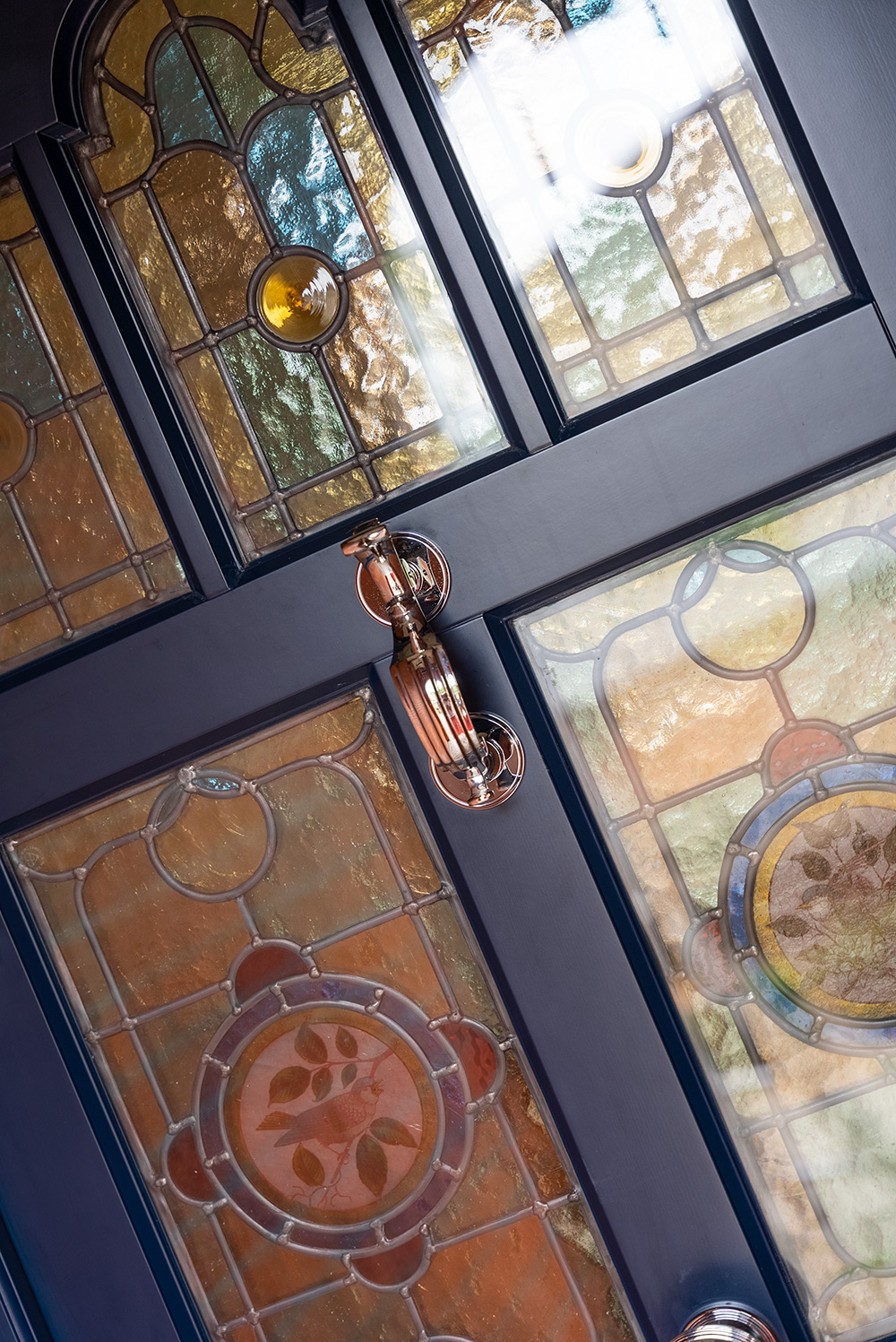 Wakehurst door design with toplight, finished in ‘Oxford Blue’ featuring bespoke stained glass throughout and Chrome Plated hardware from Samuel Heath.