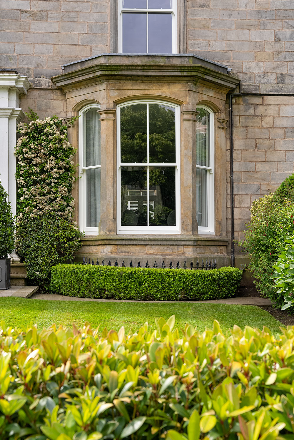 Slim sash windows with chains and weights mechanisms, were specified throughout this grand home, all finished in a colour complementary to Farrow & Ball “All White”.